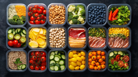 An overhead view displays vibrant food containers, each holding an assortment of fresh vegetables and fruits. The composition features a variety of colors and textures from the healthy ingredients, set against a dark background. This image could be suitable for illustrating healthy eating habits, meal prep, or food-related content.