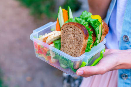 Healthy food concept: Young girl holding lunch box filled with sandwich, crispbreads, fruits and vegetables outdoor. Selective focus on lunch box.