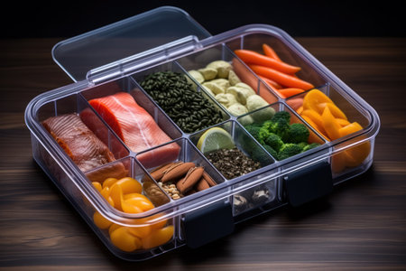 A stack of plastic containers with food inside, AI