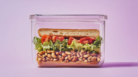 A vibrant sandwich featuring layers of fresh lettuce, juicy tomato, and crunchy peanuts, beautifully displayed in a glass container on a pink backdrop. Perfect for meal prep!