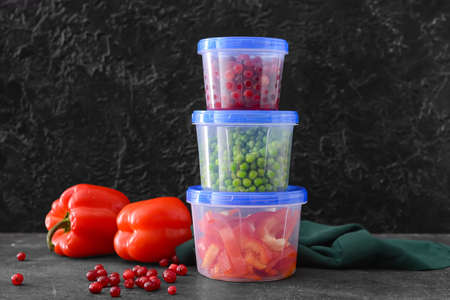Plastic containers with vegetables and cranberry on dark background