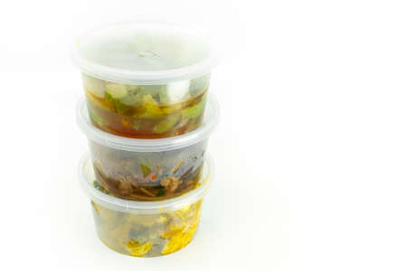 Take out food, Thai food in small container for sell in supermarket, stack container with food on white background, isolated image. Fat and short shape container.