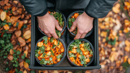 Hands carefully hold a crate filled with colorful vegetables and greens in containers, set against a backdrop of vibrant autumn foliage in a natural outdoor setting.