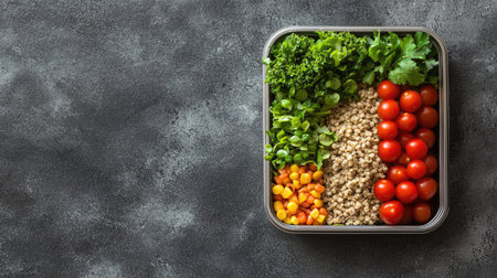 Generative AI : Lunch box with vegetables brown rice and salad Healthy eating Grey background Close up
