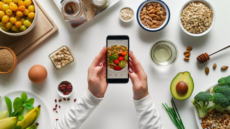 Overhead view of a person capturing food with a smartphone for social media sharing