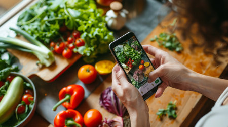 Food content creator blogger camera phone blog social media, producing and sharing content related to food channels online outlets vlogging culinary meal cooking