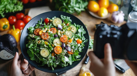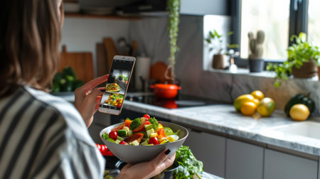 Woman taking a picture of a healthy salad in a stylish kitchen. Nutrition, diet, and food photography concept.