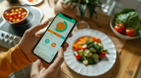 Using a tablet to manage diet, surrounded by healthy food options, promoting tech-driven nutrition.