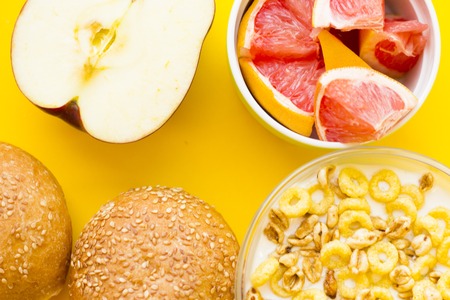 Delicious breakfast: fresh juicy apple cut in half, a bowl of muesli, buns and sliced grapefruit on a yellow background with copy space, top view
