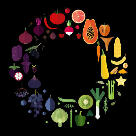 Rainbow round frame with fruits and vegetables on black background.