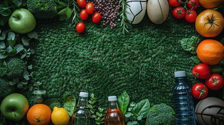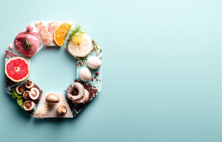 banner of circle of basic vegan ingredients and products. cereals, legumes, fresh vegetables and fruits, oils, seeds and nuts. balanced healthy diet isolated on white
