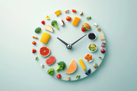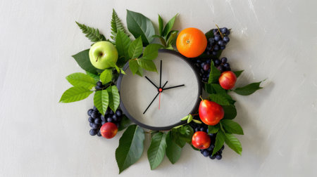 A clock from cherry tomatoes, blueberries and red chillies on a white background showing the time. Space for text.