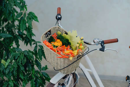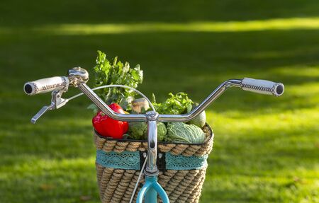 basket with fresh vegetables on bike detail