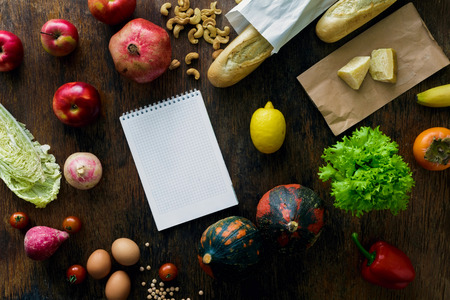 Set of raw food with a notebook on a dark wooden background. Healthy food concept