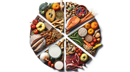 circle of basic vegan ingredients and products. cereals, legumes, fresh vegetables and fruits, oils, seeds and nuts. balanced healthy diet isolated on white