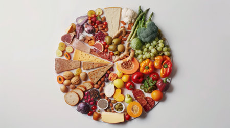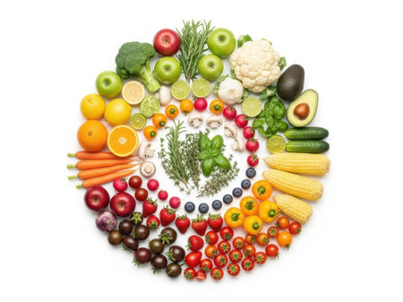 Circle of colorful fruits and vegetables isolated on a white background