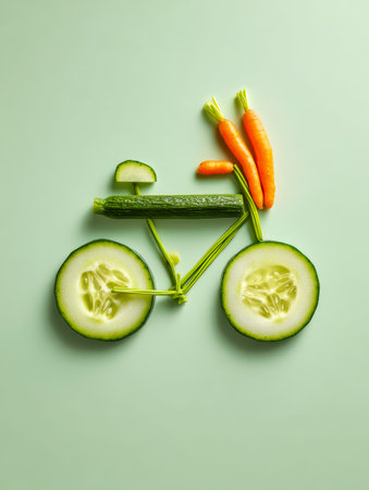 A whimsical eco-friendly sculpture featuring cucumber slices as wheels, leafy stems as frame accents, and tiny carrots as pedals, set on a soft green backdrop with a slee