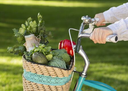 Conscious consumption. Woman ride a bicycle with full basket of fresh vegetables