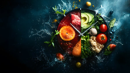 Intermittent post. Healthy breakfast with ingredients, diet food concept, healthy organic products for weight loss and weight loss, menu for cafe or restaurant, kitchen background,