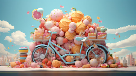 Bicycle with wheels made with round baking trays with baklavas cut into slices. Isolated pastel background. Minimal abstract creative concept of traditional dessert. Food delivery.