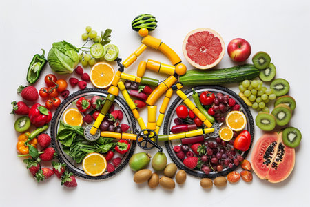 Vegetables lined up in the shape of a bicycle on a white background. The concept of weight loss, diet, healthy eating, healthy lifestyle