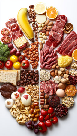 Colorful arrangement of fresh fruits and berries shaped like a human brain, highlighting the role of nutrition in cognitive function and overall well-being