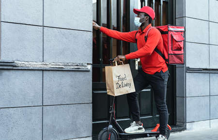African rider man delivering meal to customers with electric scooter while wearing face mask during virus outbreak - Ecological fast delivery food concept