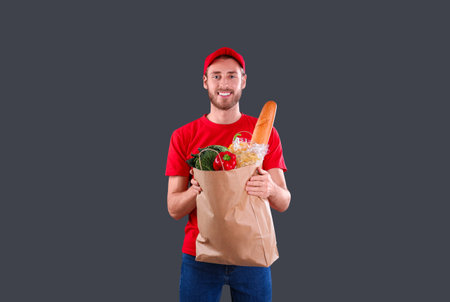 Delivery man holding paper bag with food products on dark background