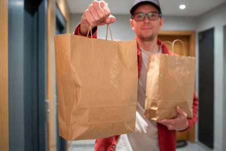 Delivery man holding paper bag with food in the entrance. The courier gives the box with fresh vegetables and fruits to the customer.