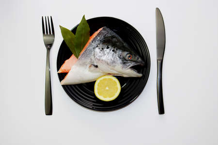 Salmon head in a black plate on a white background. Raw salmon head in a plate, lemon and bay leaf