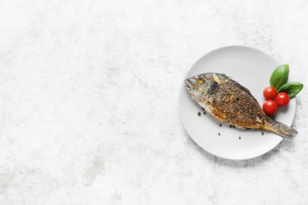 fried fish with fresh herbs, lemon and vegetables on white plate on a natural stone background