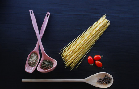 Raw spaghetti and pasta with seasonings and spices on a wooden background. food flatley.
