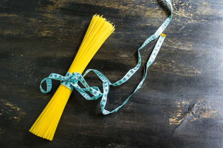 Food concept: bunch of uncooked spaghetti tied with tape measure