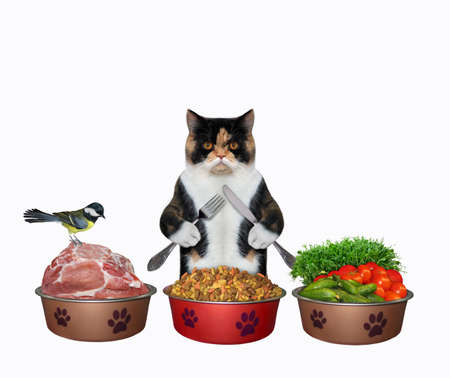 A colored cat is near three bowls of food. The first with meat, the second with dry food and the third with vegetables. White background. Isolated.