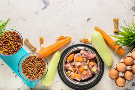 Dry pet food with natural ingredients. Raw meat, fruit and vegetables flat lay with copy space. choice between natural food and dry food for pet