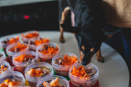 Process of preparing bowls with natural raw pet dog food at home, preparation of healthy raw barf for cats dogs, with duck, turkey, offals, meat, vegetables, assorted food portions in containers