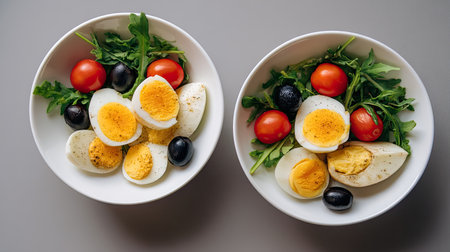 A colorful arrangement featuring boiled eggs, cherry tomatoes, black olives, and arugula in white bowls on a gray surface. Perfect for healthy meal ideas.