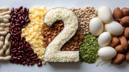 A visually appealing arrangement of diverse ingredients, forming the number two. This composition highlights healthy nuts, eggs, and grains, showcasing texture and color.