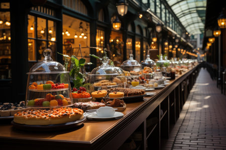 A bustling marketplace showcases a variety of fresh produce, baked goods, and prepared foods. The scene is filled with people browsing and interacting. The composition features a wide perspective, with natural lighting illuminating the diverse array of products. This image is suitable for illustrating themes related to food, commerce, and daily life.