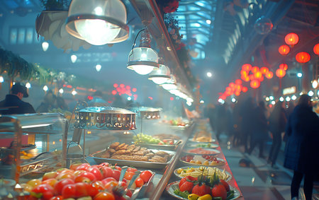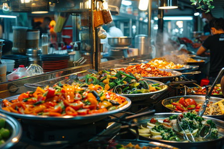 Lively and Bustling Street Food Market Showcasing a Variety of Mouthwatering Cuisines Colorful Produce and a Vibrant Atmosphere of Culture and Tradition