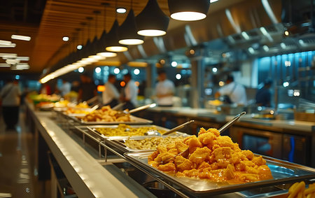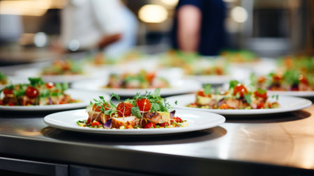 A bustling catering event, with chefs preparing exquisite dishes in an open kitchen. Catering buffet food indoor in restaurant