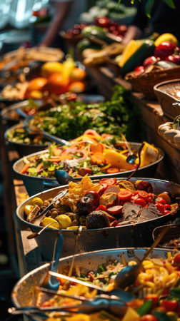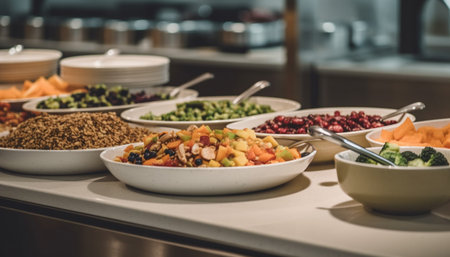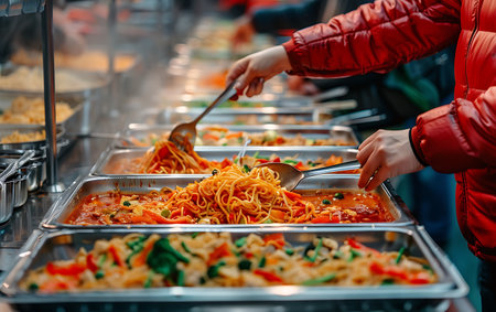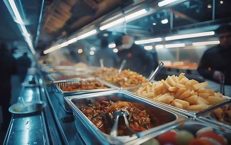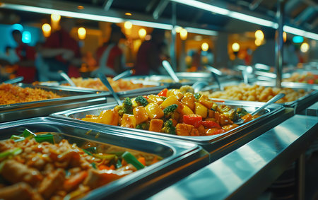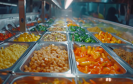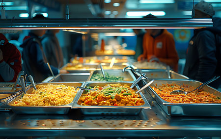 A vibrant buffet line showcases a wide array of fresh vegetables and healthy food options. People are seen serving themselves nutritious meals in a bustling cafeteria setting.