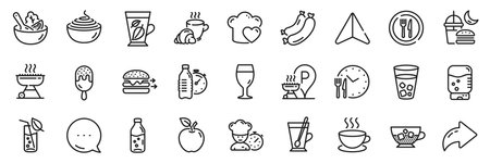 Salad, Grill place and Chef line icons pack. Share, Message, Paper plane icons. Food time, Sausage, Night eat web icon. Water glass, Tea mug, Ice tea pictogram. Vector