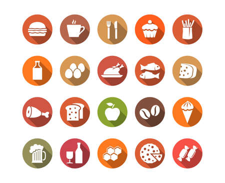 A collection of flat design icons featuring various food and drink items arranged in rows on a white background.