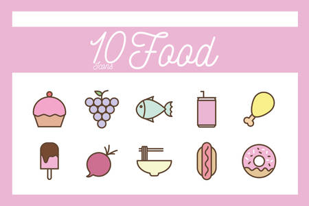 10 line and fill style icon set design, Eat food restaurant menu dinner lunch cooking and meal theme Vector illustration