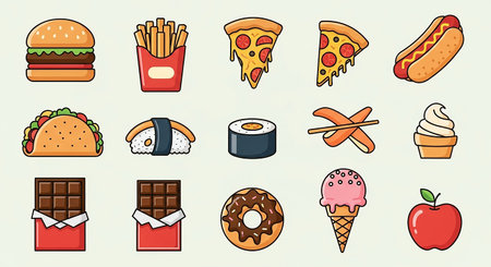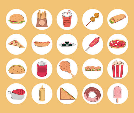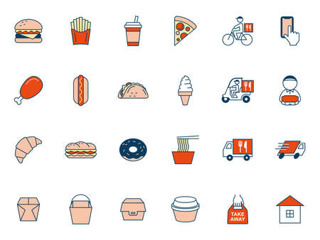 Vector colorful icon of burrito, pizza, coffee, hot dog, wok box. Isolated on white background.