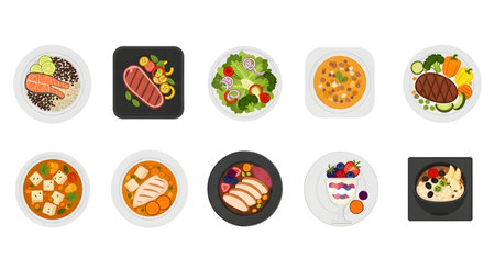 A collection of diverse and appetizing meals, featuring various protein sources, vegetables, and sides. Perfect for showcasing healthy eating options.