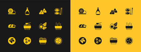Set Dumpling with chopsticks Wonton Chicken egg vegerables Asian noodles bowl Ramen soup Zongzi bamboo steamer Xiao long bao and Soy sauce bottle icon. Vector.