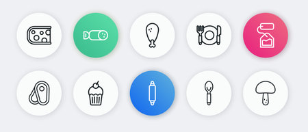 Set line Rolling pin Tea bag Steak meat Spoon Plate fork and knife Chicken leg Mushroom and Muffin icon. Vector.