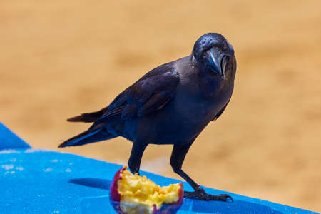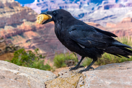 beautiful large raven with a piece of bread in its beak on the background of the Grand Canyon